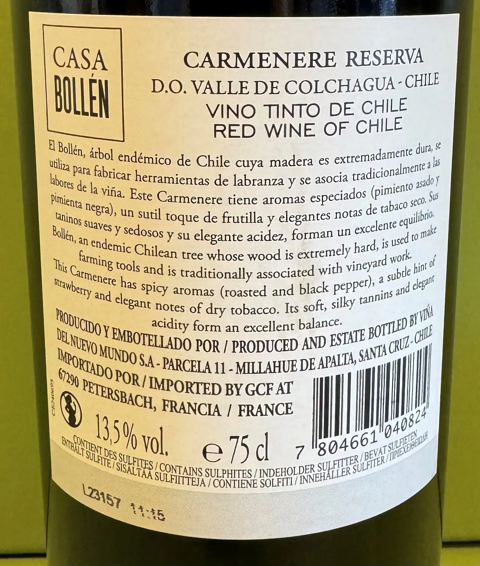 Oplev essensen af en ægte chilensk vin. Denne vin er fremstillet af den ikoniske Carmenère-drue, rig og fyldig smag, der på fineste vis præsentere Chiles unikke terroir. Noter af modne mørke bær, blommer og et hint af krydderier.